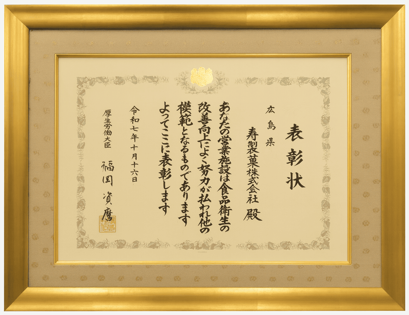 このたび、寿製菓株式会社は、令和7年度の食品衛生優良施設として厚生労働大臣表彰を受賞いたしました。